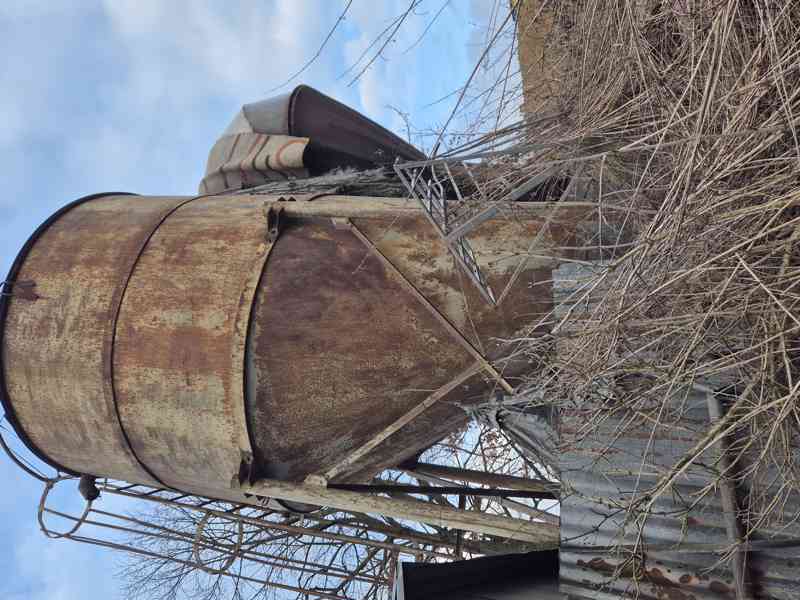 Ocelový zásobník původně na krmivo pro zvířata,nyní cyklon u tryskárny, objem cca 7 m3.